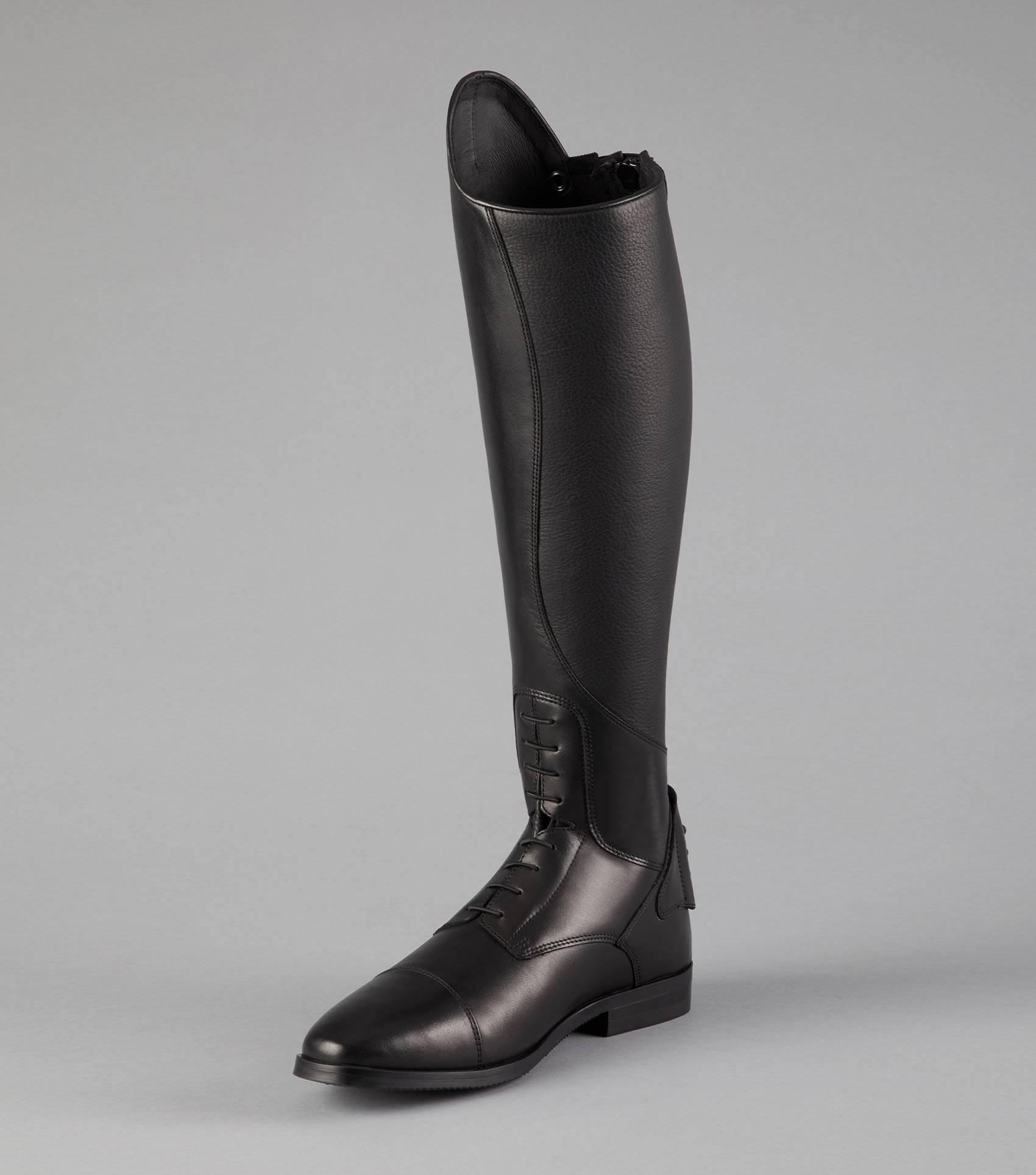 The freedom of movement that these leather riding boots provide is enhanced by the elastic lace panel, which increases flexibility and comfort around the ankle area. A full-length rear zip and snap button closure provide the means for easy and convenient removal. The Botero design provides a close contact, sculpted fit that contours the calf comfortably due to the discreet elastic panel which is strategically placed along the length of the zip.